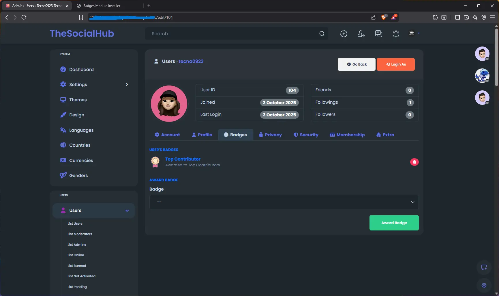 User edit badges tab