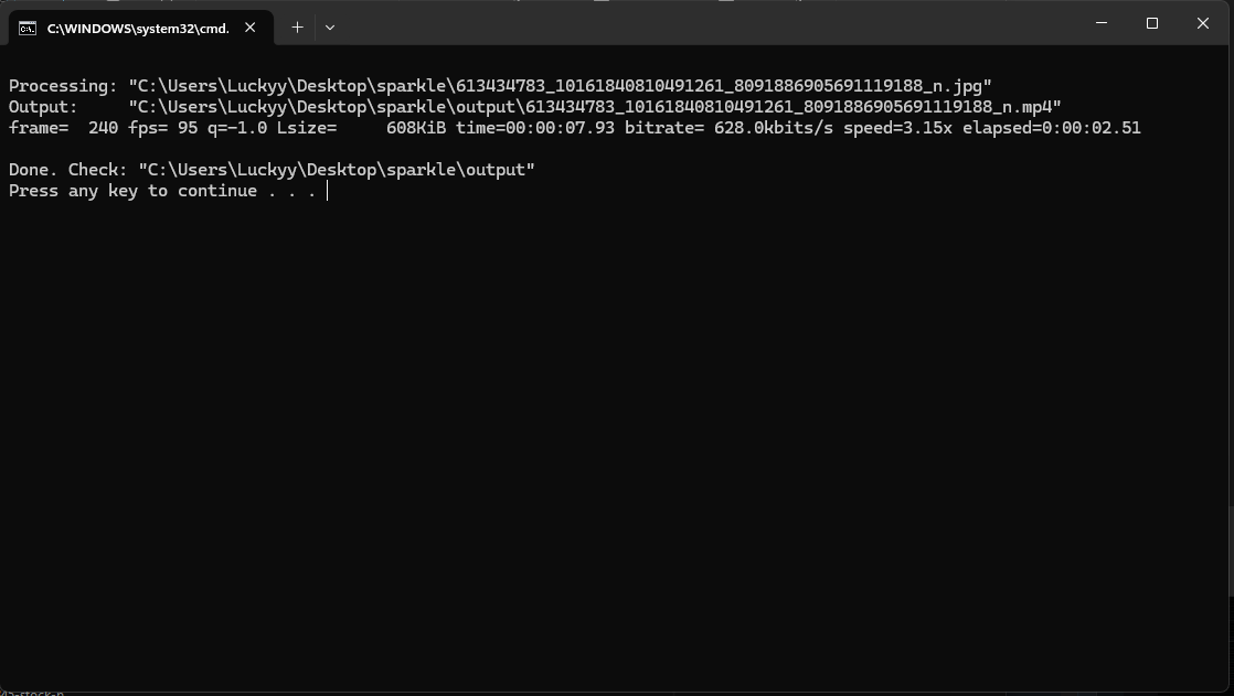 This Windows batch tool uses FFmpeg to convert images into perfectly formatted 9:16 videos with a subtle animated overlay, consistent duration, and platform-optimized settings.