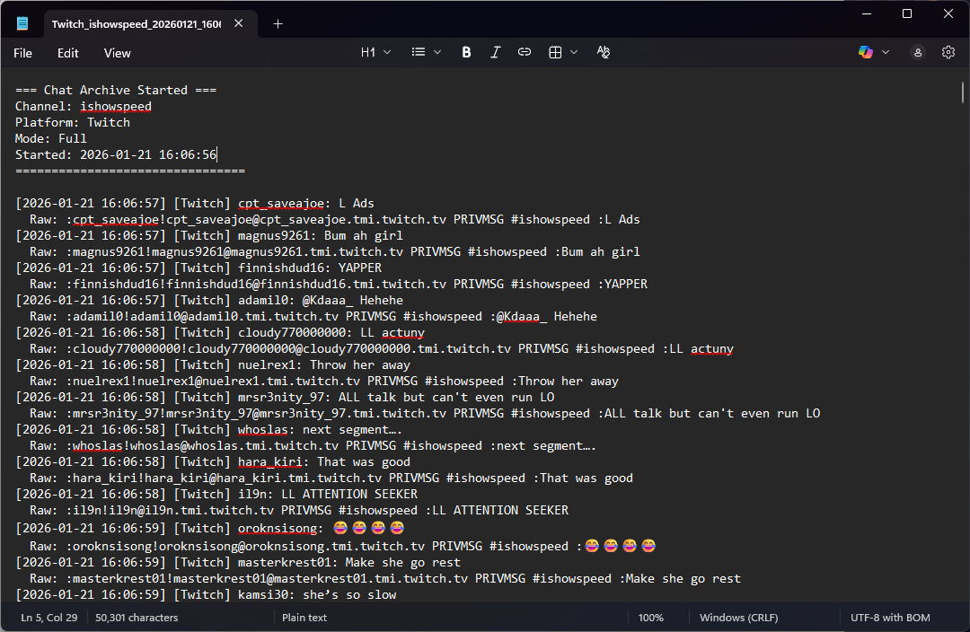 - Organized file naming: `Twitch_channelname_YYYYMMDD_HHMMSS.txt`